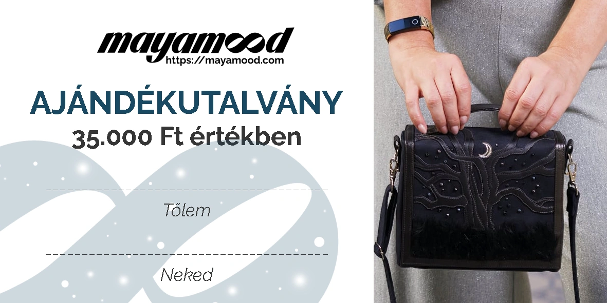 Mayamood ajándékutalvány 10.000 és 45.000 Ft közötti értékben, melyet Mayamood táskákra lehet beváltani.