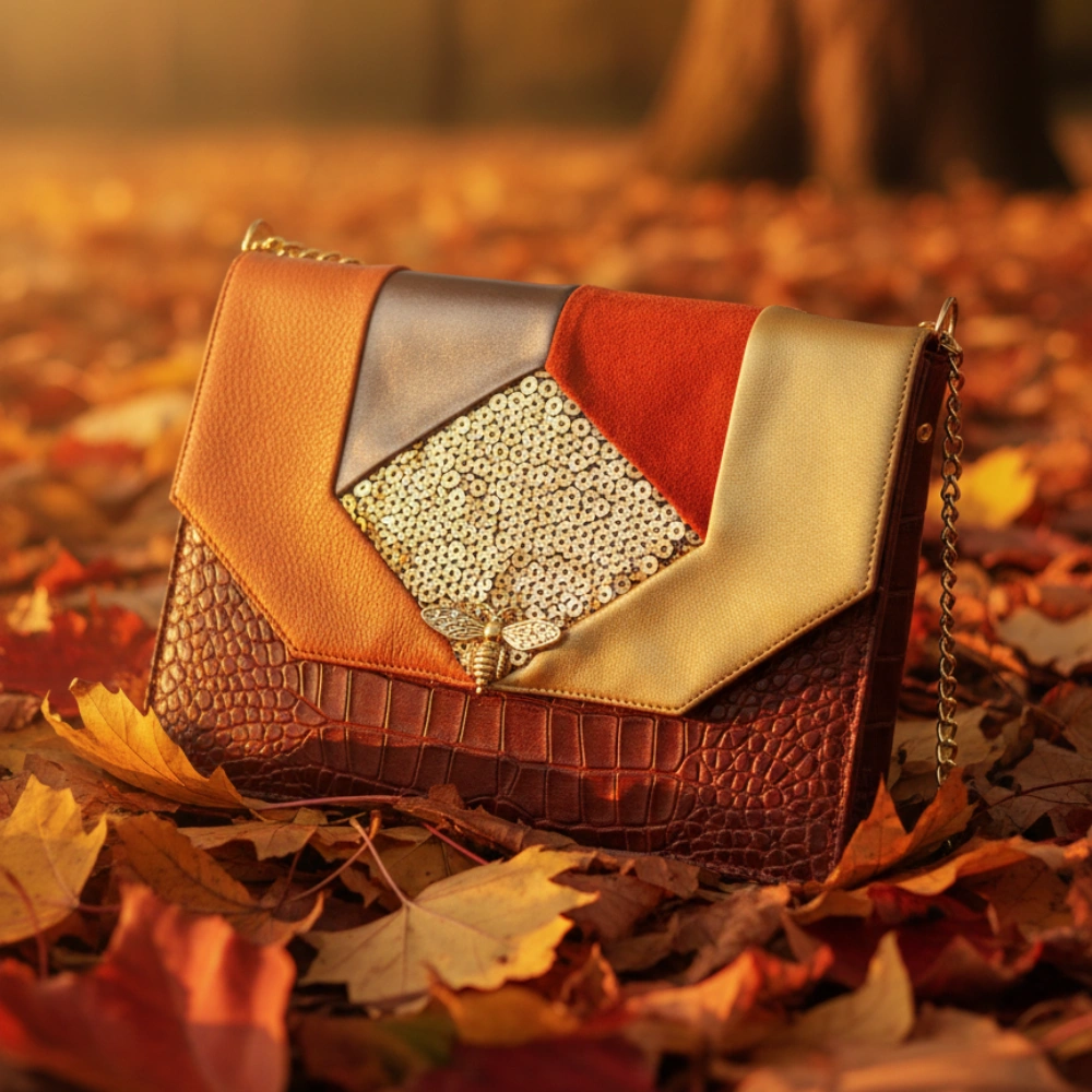 Női kistáska, melynek geometrikus mintázatú fedele különböző színű és mintájú műbőrből, patchwork technikával készült. Teste agyagbarna színű, krokodilmintás, elöl arany színű, méhecske formájú csattal záródik. Mérete 24*18*5 cm. Vállpántja három részből áll, egy krokodilmintás műbőr – 3cm széles – pántból, és két db 30/30 cm-es arany színű fém láncból. Vállpántja 65-125 cm-ig állítható, vállon átvetve is hordható. A láncok levehetőek, így csak a rövid, 65 cm hosszú pánttal is használható, a láncok karabínerrel állíthatóak a megfelelő méretre. Pántja teljesen levehető, akár kézitáskaként is hordható. Belül egy 12*19 cm-es cipzáros zsebbel.