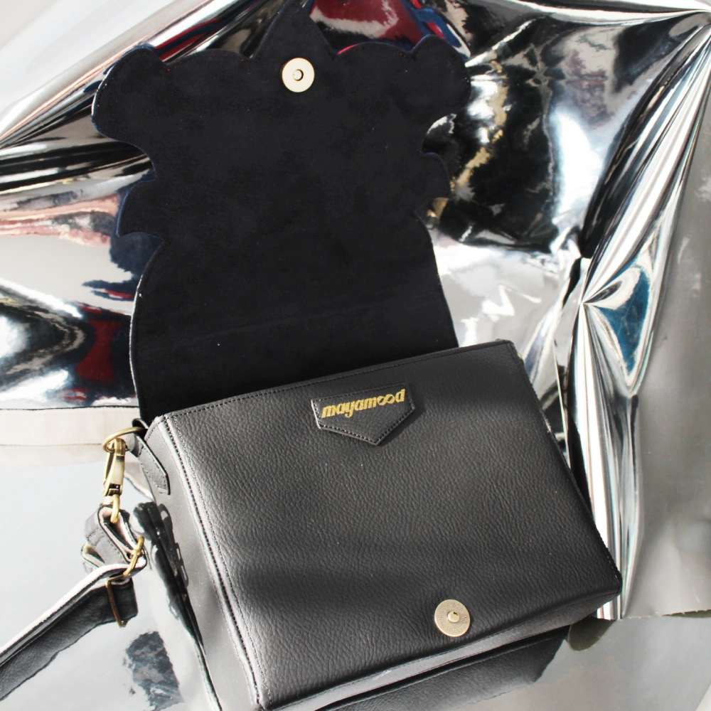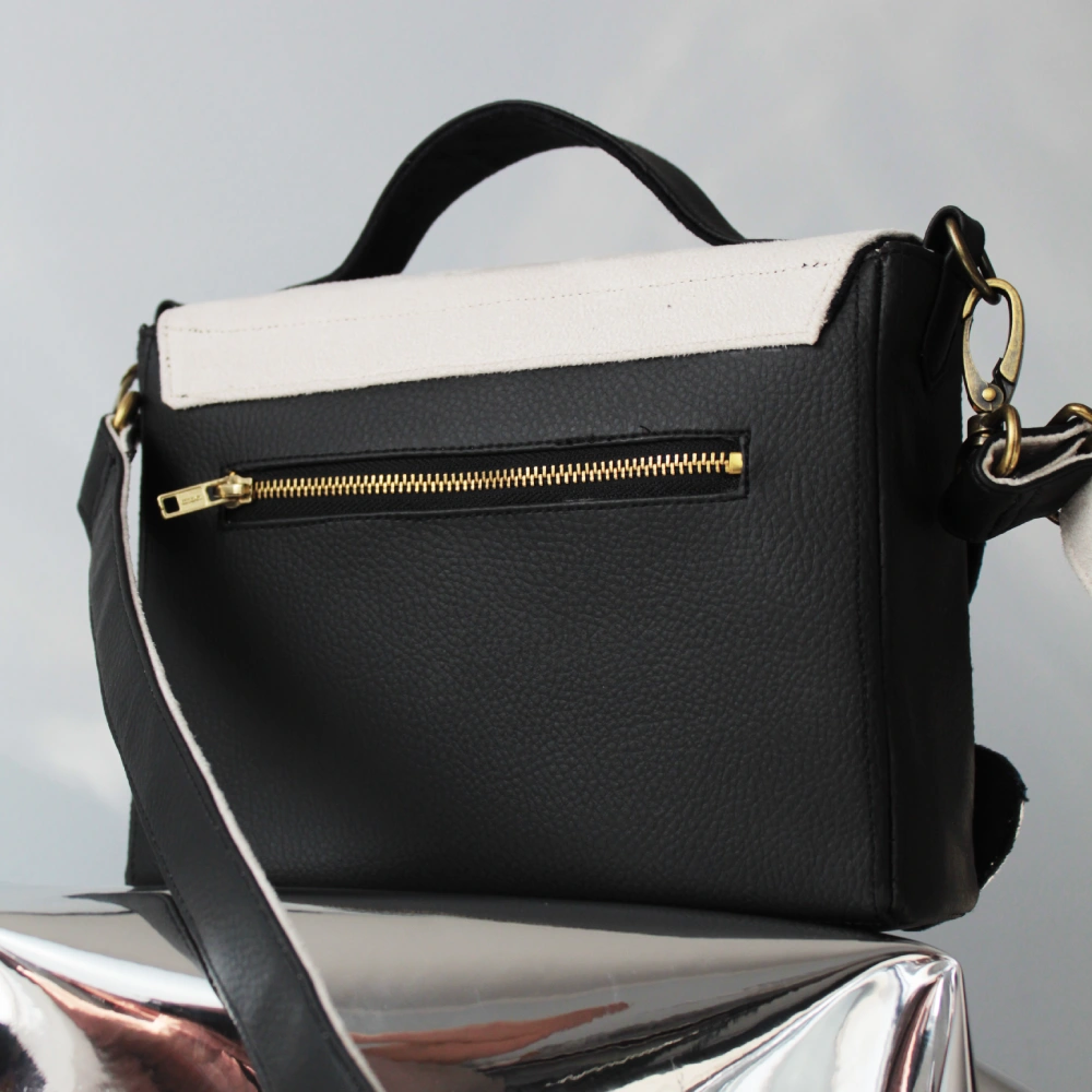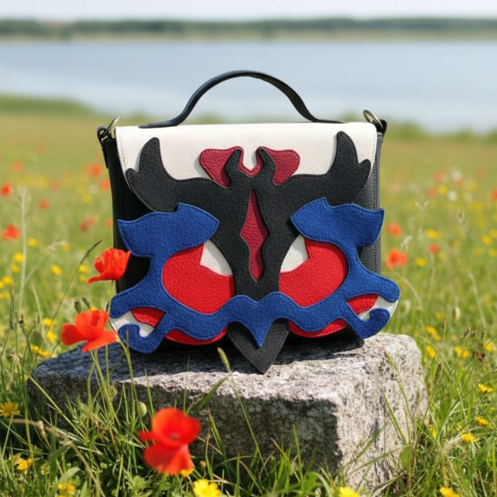 Női kistáska, melynek nonfiguratív, formára vágott fedele különböző színű és felületű műbőrből, rétegezés technikával készült. A táskatest mérete 20*15*6 cm. borítója 20*19*6cm. Kétszínű vállpántja vállpántja 67-116 cm-ig állítható, vállon átvetve, vagy a vállpánt levételével kézitáskaként is hordható. Hátul egy cipzáros, 14*10 cm-es, belül egy 10*17 cm-es zsebbel, melybe fektetve elfér egy mobil.