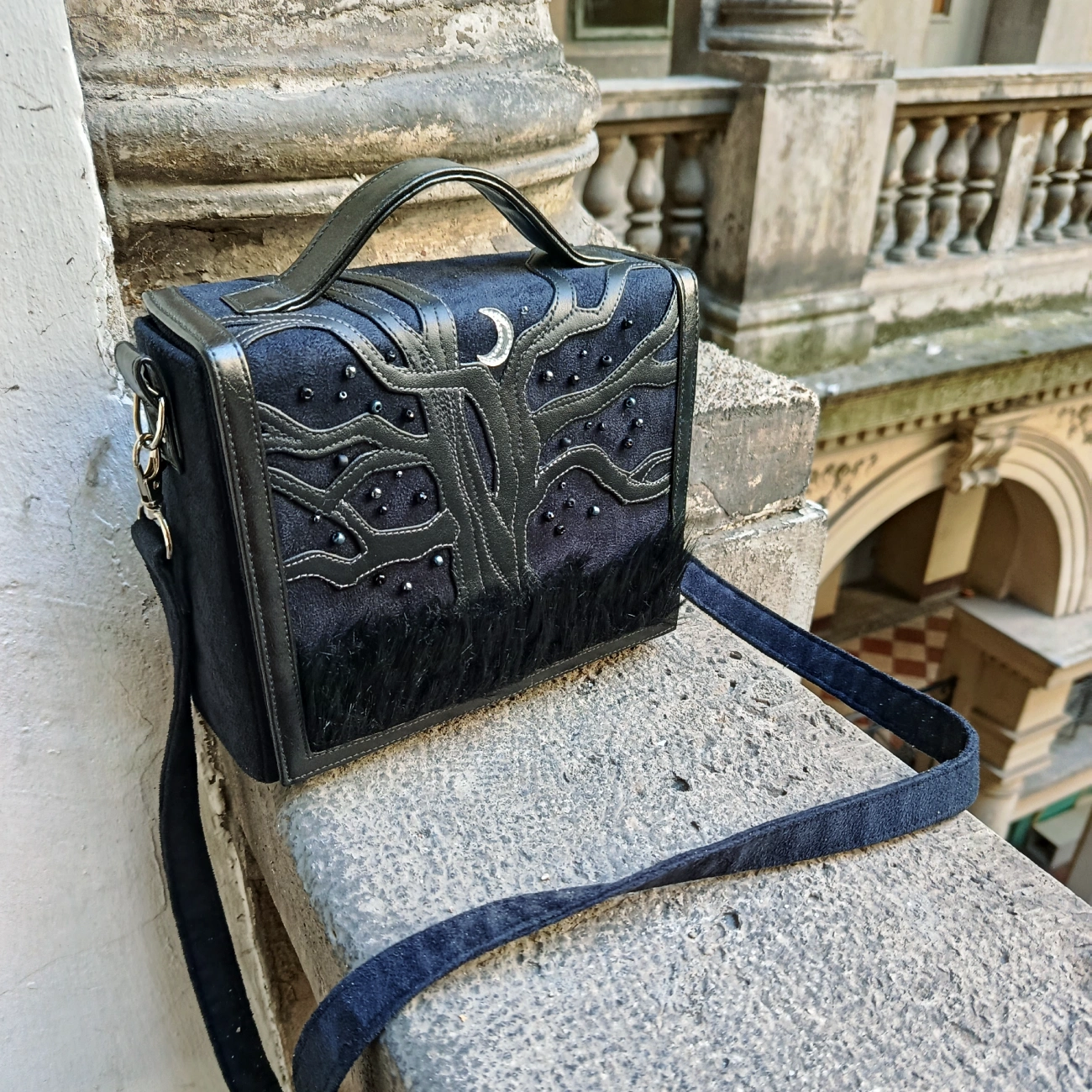 Női kistáska, melynek fát ábrázoló fedele különböző felületű fekete műbőrből és műszőrméből, rétegezés technikával készült, továbbá gyöngyökkel van díszítve. A táska mérete 20*18*7 cm. Vállpántja vállpántja 67-116 cm-ig állítható, vállon átvetve, vagy a vállpánt levételével kézitáskaként is hordható. Belül egy cipzáros 18*13 cm-es, és egy 18*10 cm-es zsebbel, melybe fektetve elfér egy mobil.